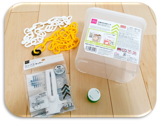 深型のタッパー、チェーン、ペットボトルのフタ、ビニールテープ、コンパスカッター