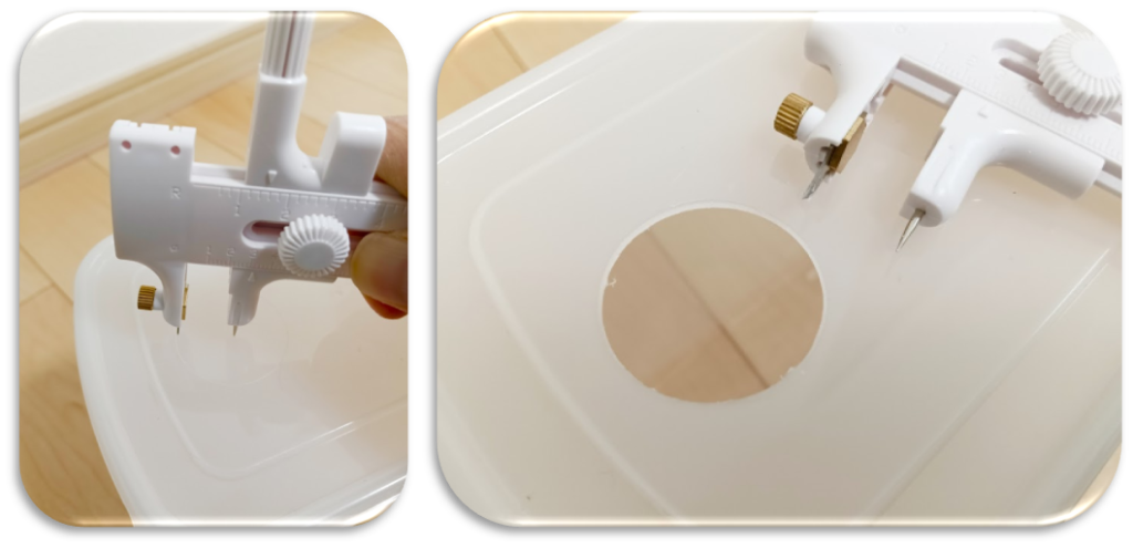 1.コンパスカッターを使ってタッパーに2種類の穴をあけます。