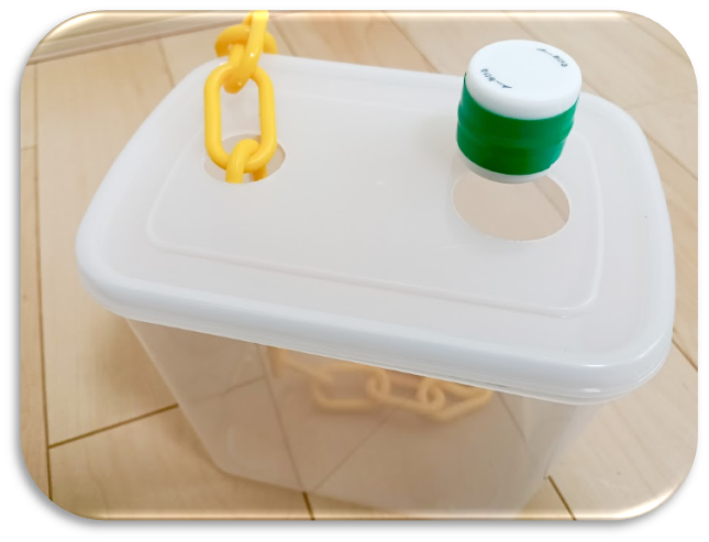 チェーンとペットボトルのフタを穴に入れて遊びます。