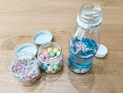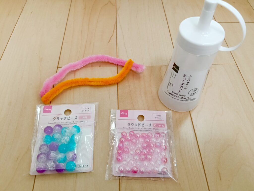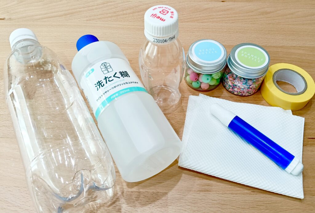 洗濯のり、水、ペットボトル、スパンコール、ビーズ、ビニールテープ