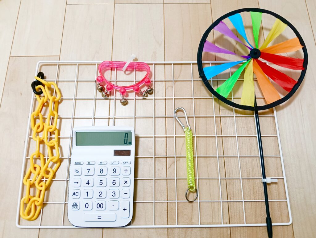ワイヤーネット、電卓、チェーン、スプリングキーホルダー、スズ、風車、結束バンド