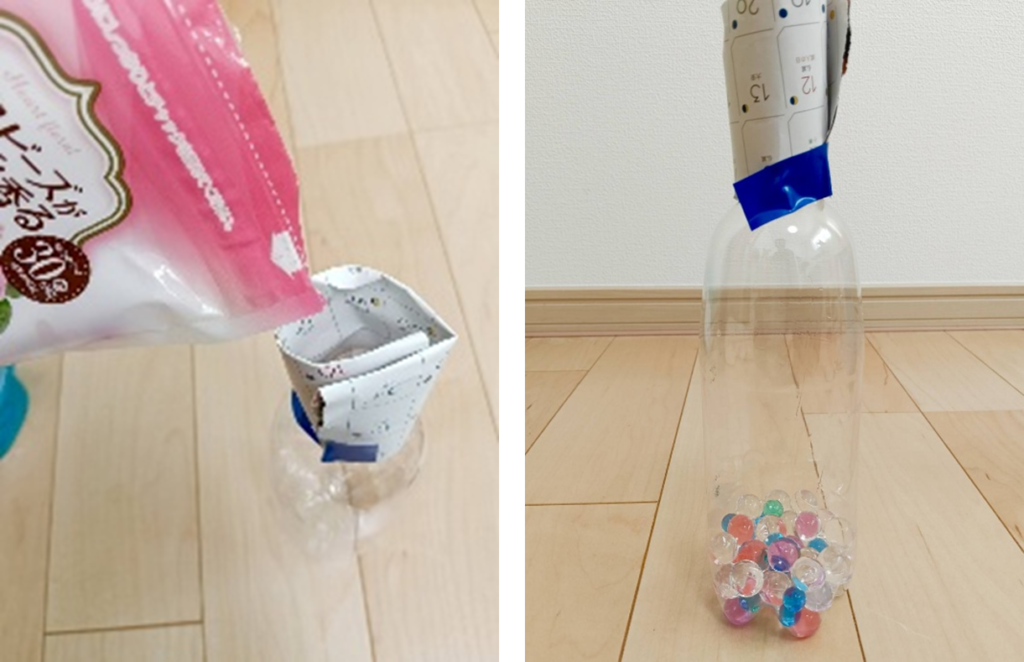 消臭ビーズ、ペットボトル、水、ビニールテープ
