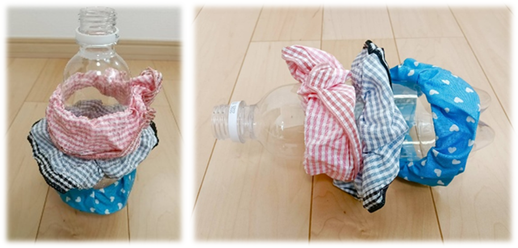 ・ペットボトルから、シュシュを取ったり、手につけたりして遊ぶ。